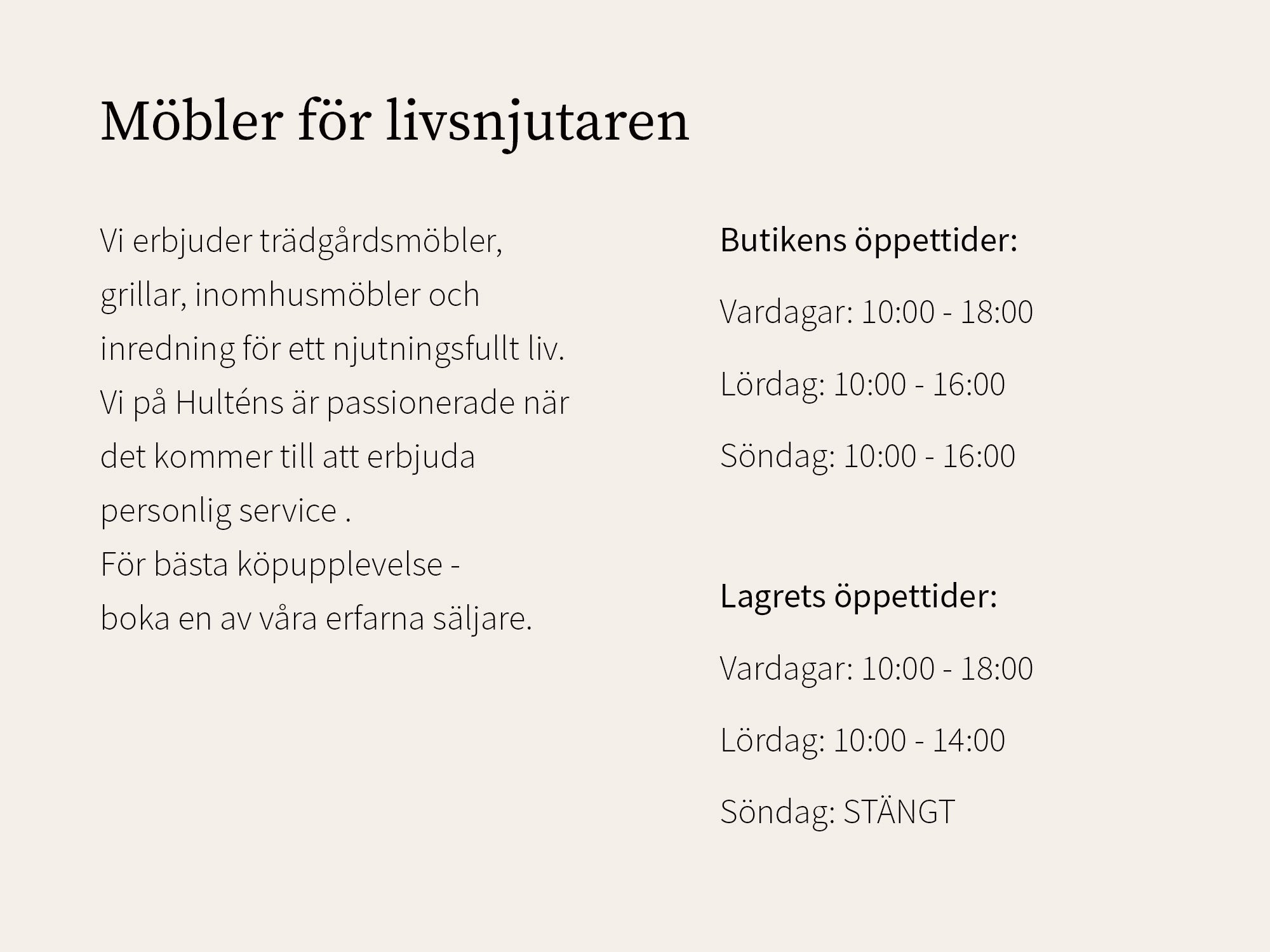 Vi erbjuder trädgårdsmöbler, inomhusmöbler, grillar och inredning för ett njutningsfullt liv. Vi på Hulténs är passionerade när det kommer till att erbjuda personlig service. För bästa köpupplevelse-boka en av våra erfarna säljare.