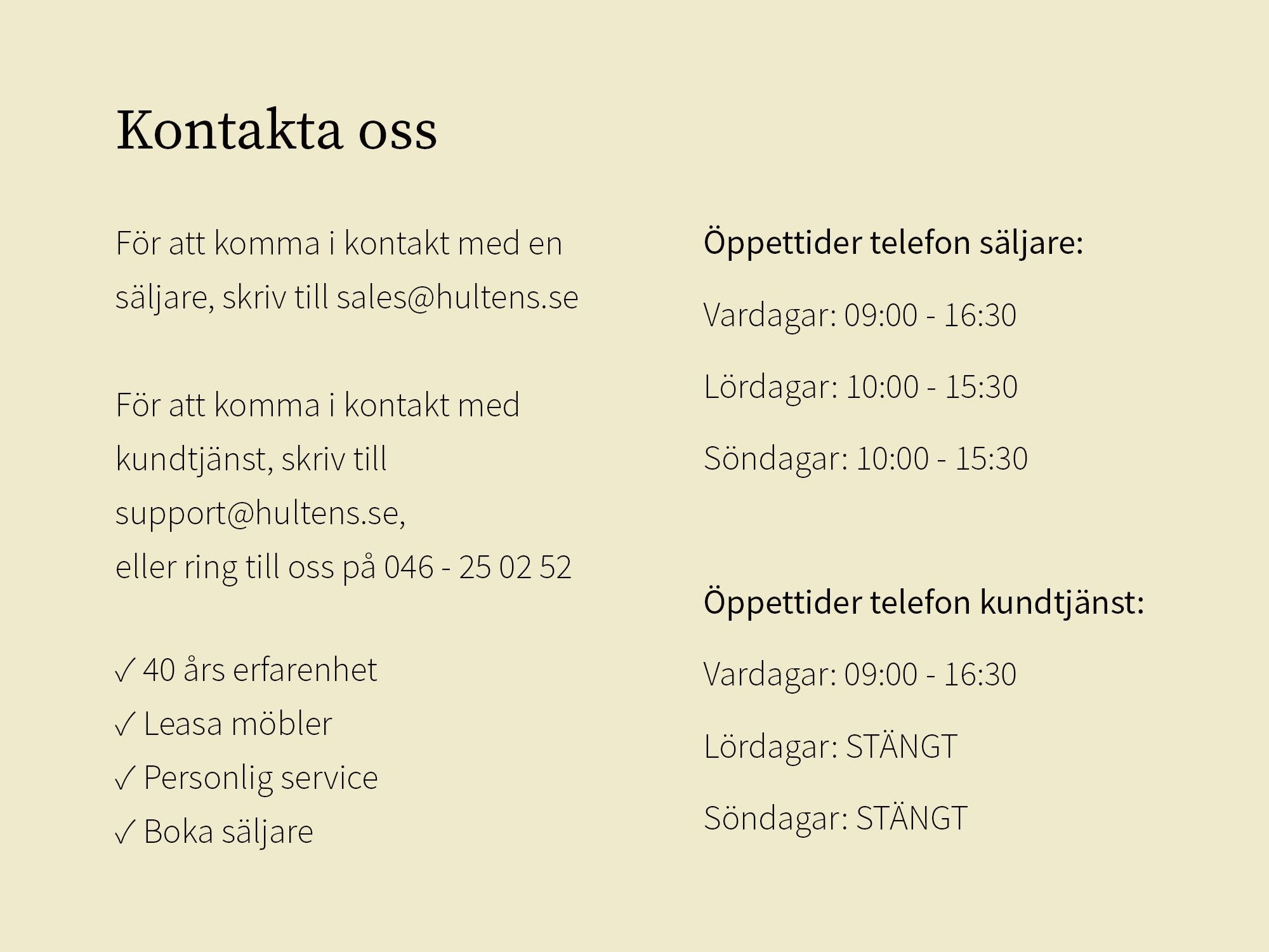 När det gäller din inredning och möbelbehov är våra duktiga säljare redo att guida dig genom varje steg. Vi på Hulténs är passionerade när det kommer till att erbjuda personlig service och se till att våra kunder får den uppmärksamhet de förtjänar. Du kan enkelt nå oss genom att skicka ett mail till sales@hultens.se eller genom att ringa oss på 046–250252.