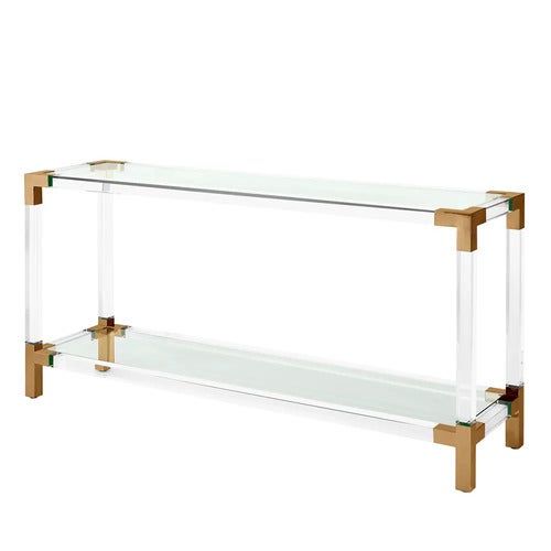 Avlastningsbordet Royalton kombinerar modern elegans med tydliga influenser från Bauhaus-design. Bordets två skivor i klart glas löper parallellt mellan vertikala akrylstavar, medan hörn och ben i borstad mässingsfinish förstärker det stilrena uttrycket. Ett perfekt tillägg för hall, vardagsrum eller sovrum där du vill skapa en exklusiv och samtida atmosfär. Komplettera gärna med belysning och inredningsdetaljer ur Eichholtz kollektion för en enhetlig look.