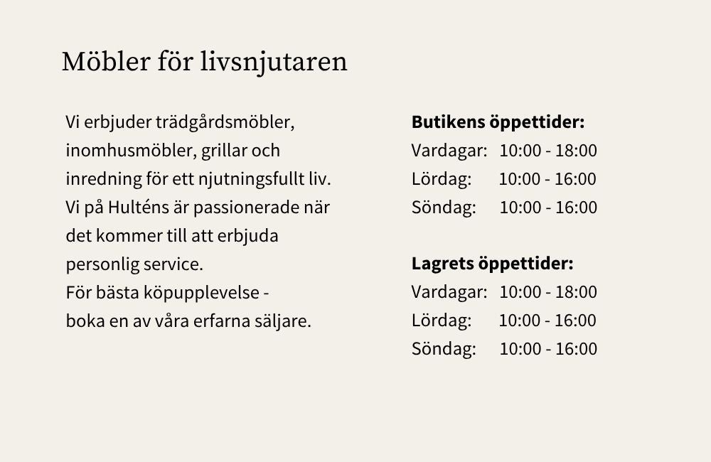 Hos Hulténs får du som kund personlig service och hjälp. Vi är experter på möbler och heminredning och brinner för att göra alla våra kunder nöjda. Butiken finns på Meteorvägen 4, nära väg 11 och 108. Vi har en stor gratis parkering och över 2500 kvadrat med inne- och utemöbler. Här kan du få möblerna hemkörda eller låna ett släp.