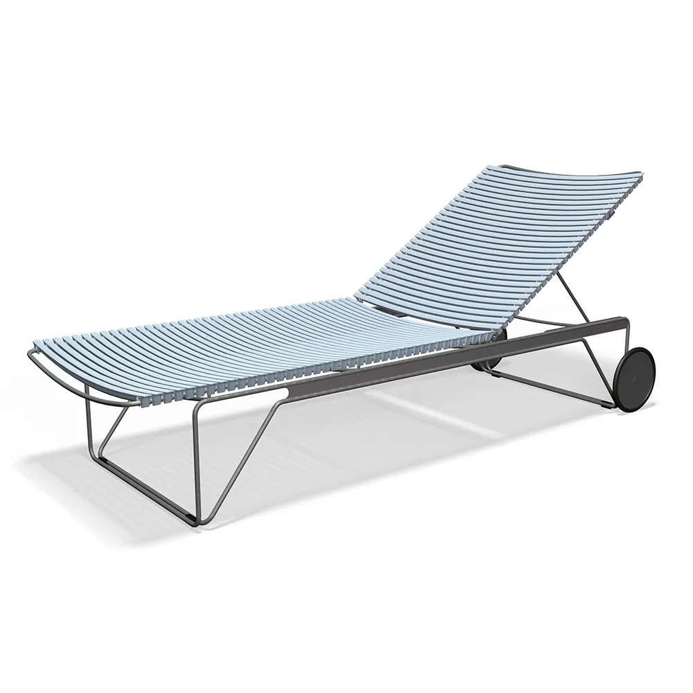Ramen är tillverkad i pulverlackerat stål i en mörkgrå ton som ger stabilitet och lång hållbarhet. Solstolen är både höjbar och utrustad med diskreta hjul på ena sidan, vilket gör den enkel att flytta och använda. CLICK-serien finns i flera färger, vilket gör det lätt att skapa en personlig och sammanhållen utomhusmiljö.