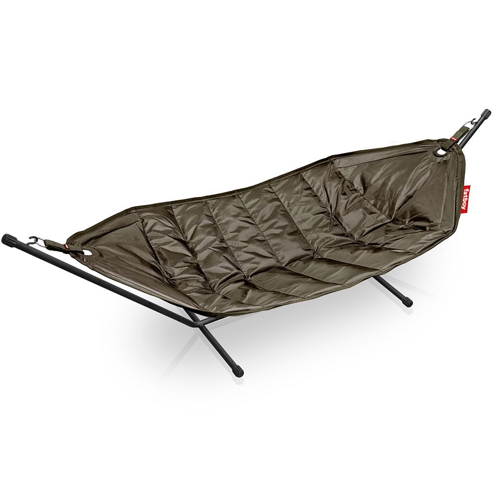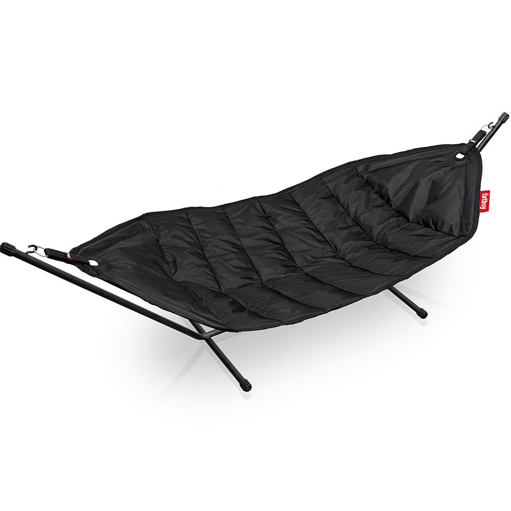 Den här hängmattan med stativ i svartlackerat stål erbjuder generös plats och stabil komfort för avkoppling både ute och inne. Det vadderade, vattenavvisande tyget gör den bekväm, lättskött och enkel att ta med tack vare den medföljande väskan.
