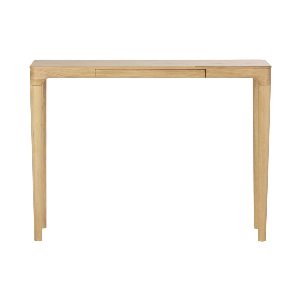 För att framhäva ekens naturliga värme finns bordet i tre stilrena färger: Cloud Grey, Moss Green och Obsidian Black. Den diskreta designen rymmer även en tygfodrad låda, idealisk för att förvara småsaker, bestick eller viktiga papper nära till hands.