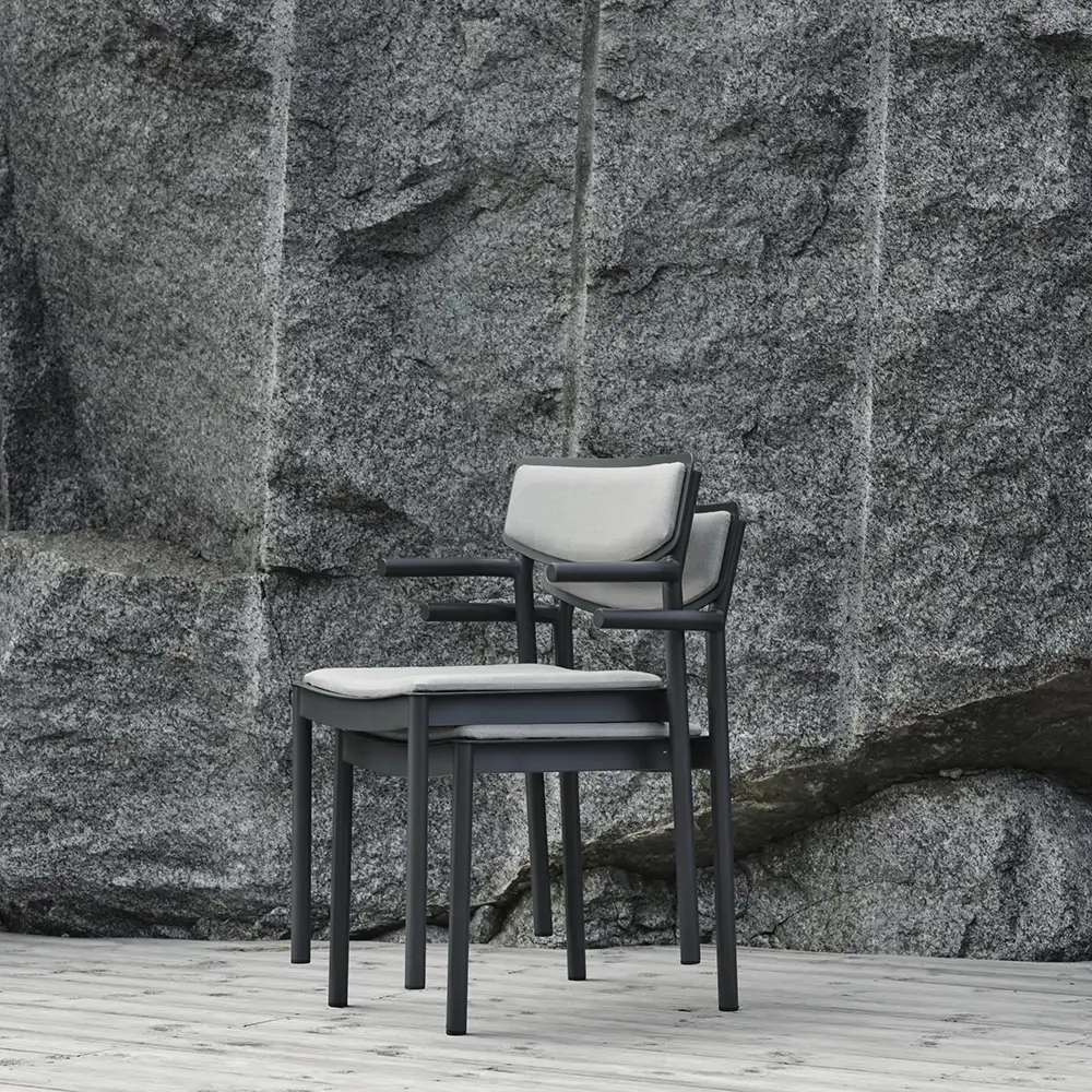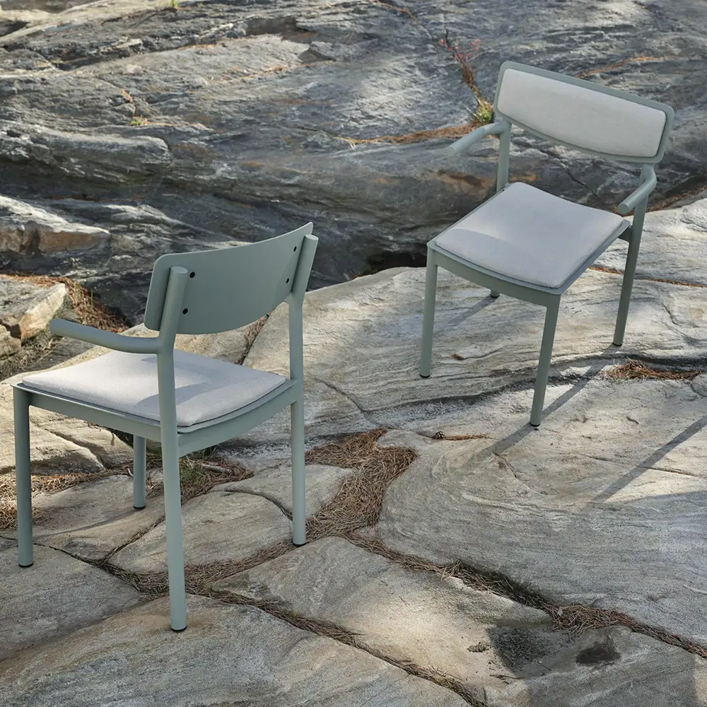 Stabil serie av utestolar för uteplats, trädgård och uterum. Gemensamt för stolarna är att de är tillverkade i aluminium och textilklädd sits och ryggstöd.