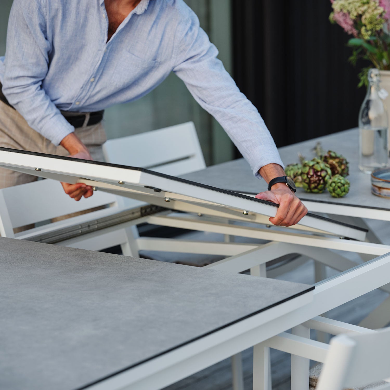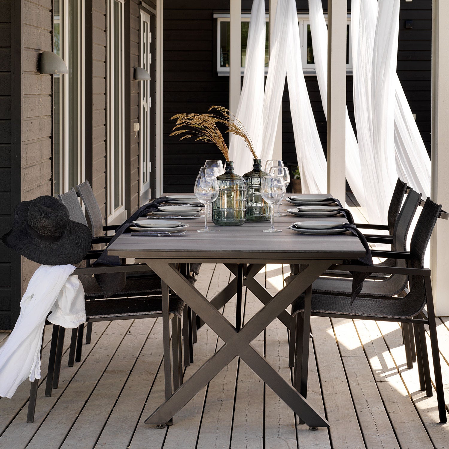 Matborden i Hillmond serien kommer i två olika färger, svart och vitt. I utförandet väljer man mellan hela bordet i aluminium med präglat trämönster eller en trämönstrad laminatskiva (HPL) som finns i färgerna grå och natur. Matborden som är helt i aluminium finns i måtten 160/220x100 och 240/310x100 medan matborden med laminat finns i storlekarna 166/226x100 och 238/297x100. De varierade måtten och möjligheten att välja utförande gör att serien passar i de flesta miljöer och många olika inredningsstilar. Med Hillmonds matbord är det enkelt att göra en snygg och personlig dukning för att skapa och ge en inbjudande och hemtrevlig känsla. Oavsett om det är en familjemiddag med nära och kära, en enkel sommarfrukost under semestern eller om det är det stora midsommarfirandet som står på schemat så är matborden i Hillmond serien perfekta.