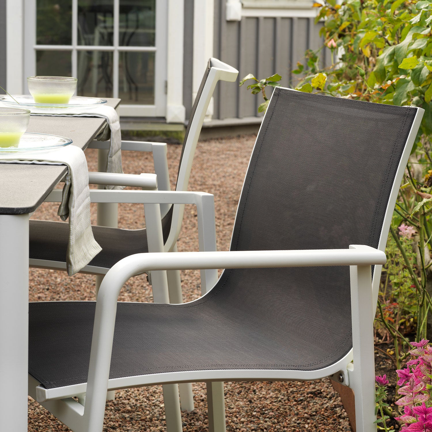 Renoso serien består av matbord, stapelstolar och positionsstolar som kommer ta din uteplats till en ny nivå. Både borden och stolarna är tillverkade i aluminium vilket innebär att de är underhållsfria, enkla att sköta och hållbara för utomhusbruk. Renoso matbord finns att köpa i två olika storlekar, 220x100 och 160x100, och två olika färger, svart stativ/svart skiva och vitt stativ/svart skiva. Kombinera ditt Renoso matbord med antingen Renoso stapelstol eller Renoso positionsstol. Dessa finns att köpa i samma färger som Renoso matbord, dvs. svart stativ/svart väv och vitt stativ/svart väv.