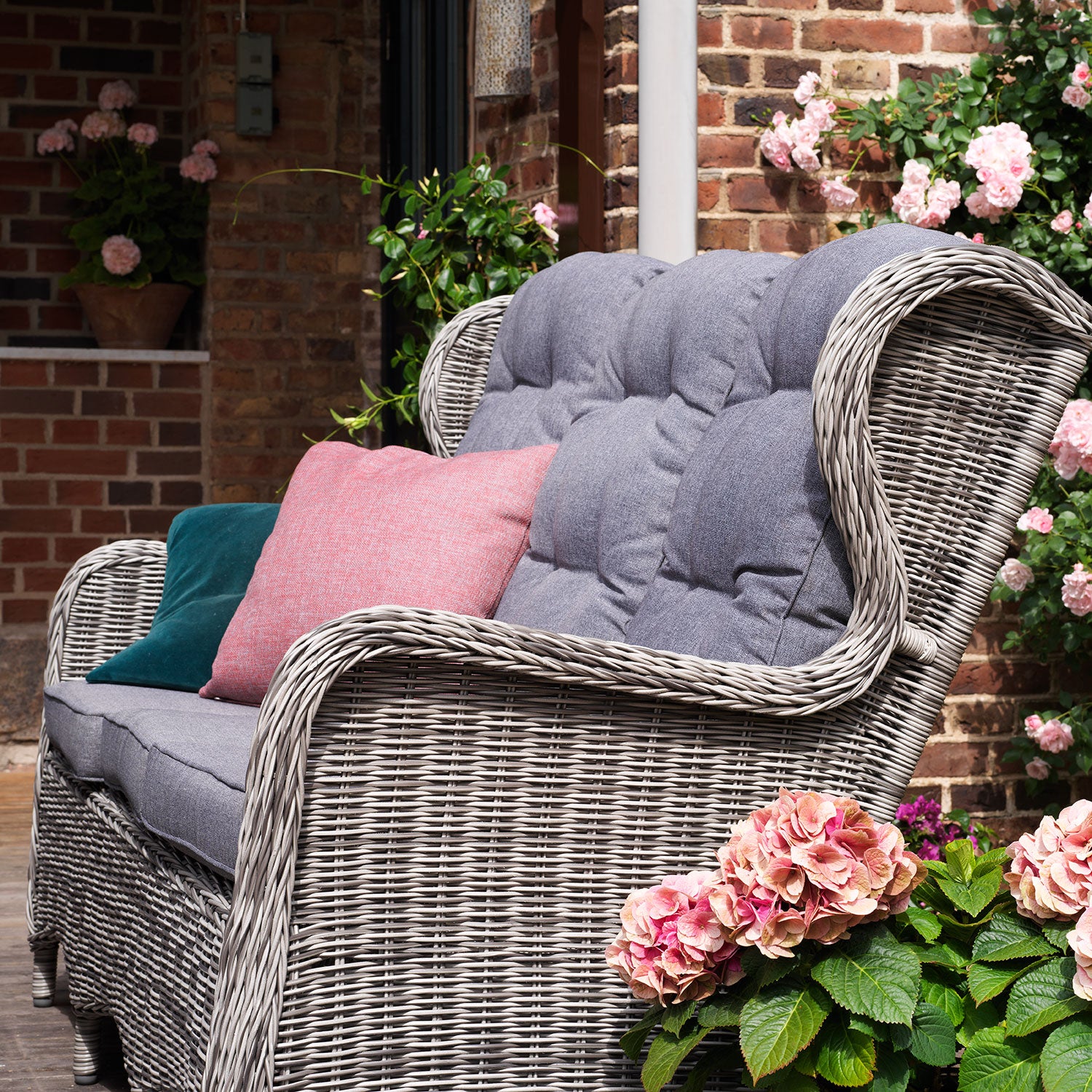 Serien är gjord i konstrotting som är ett underhållsfritt och tacksamt material för utemöbler. Det är enkelt och smidigt att hålla efter och kräver inte speciellt mycket omtanke till skillnad från mer känsliga naturmaterial. Dynorna i serien är sydda i kvalitativt olefintyg som lämpar sig utmärkt för utomhusbruk. Tyget är vattenavvisande och bleks långsammare i solen, vilket gör att tyget lämpar sig väl för utemöbler.
