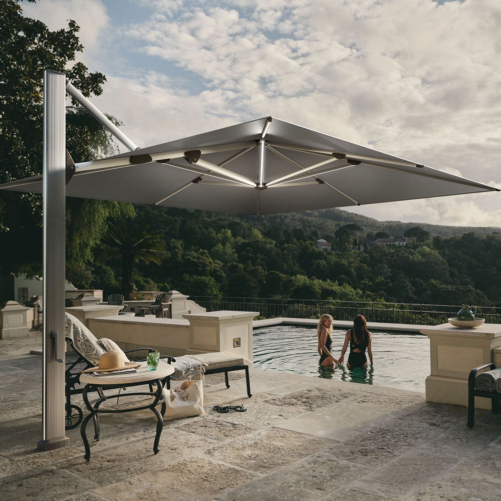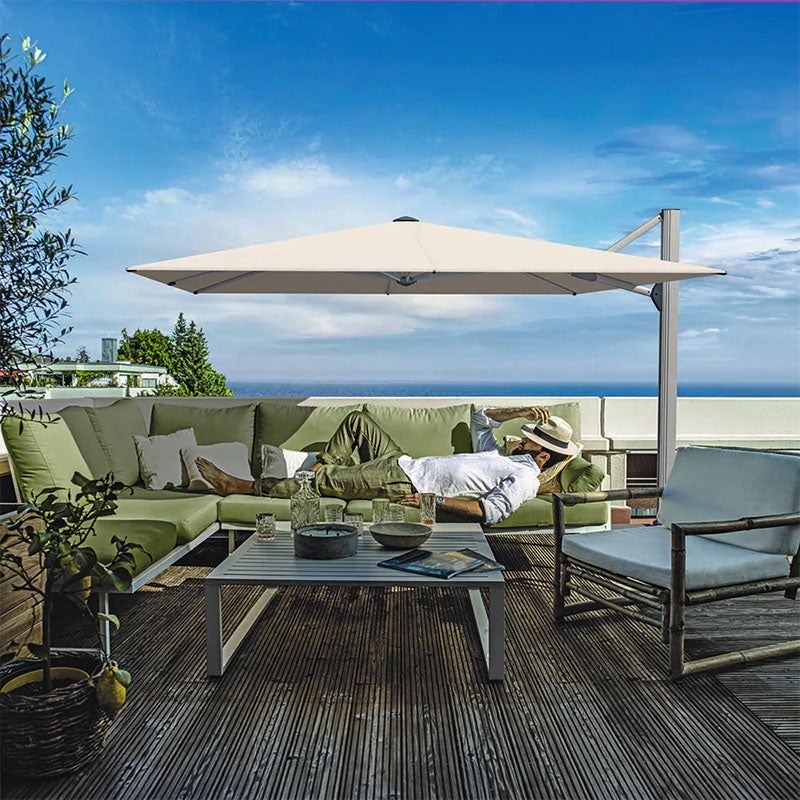Ambiente Nova uppfyller önskemålen hos krävande individualister: vårt största parasoll med sidomast finns i olika specialstorlekar utöver standardstorlekarna. Stommen finns i alla RAL-färger och dessutom finns det skärmtak i 55 färger att välja mellan. Komfortveven säkerställer en smidig, synkroniserad öppning av parasolltaket utan att vidröra möblerna. Ytterligare tillval som det individuellt styrbara LED-belysningssystemet och den motoriserade öppningsmekanismen gör detta sidomastparasoll perfekt för privata hem.