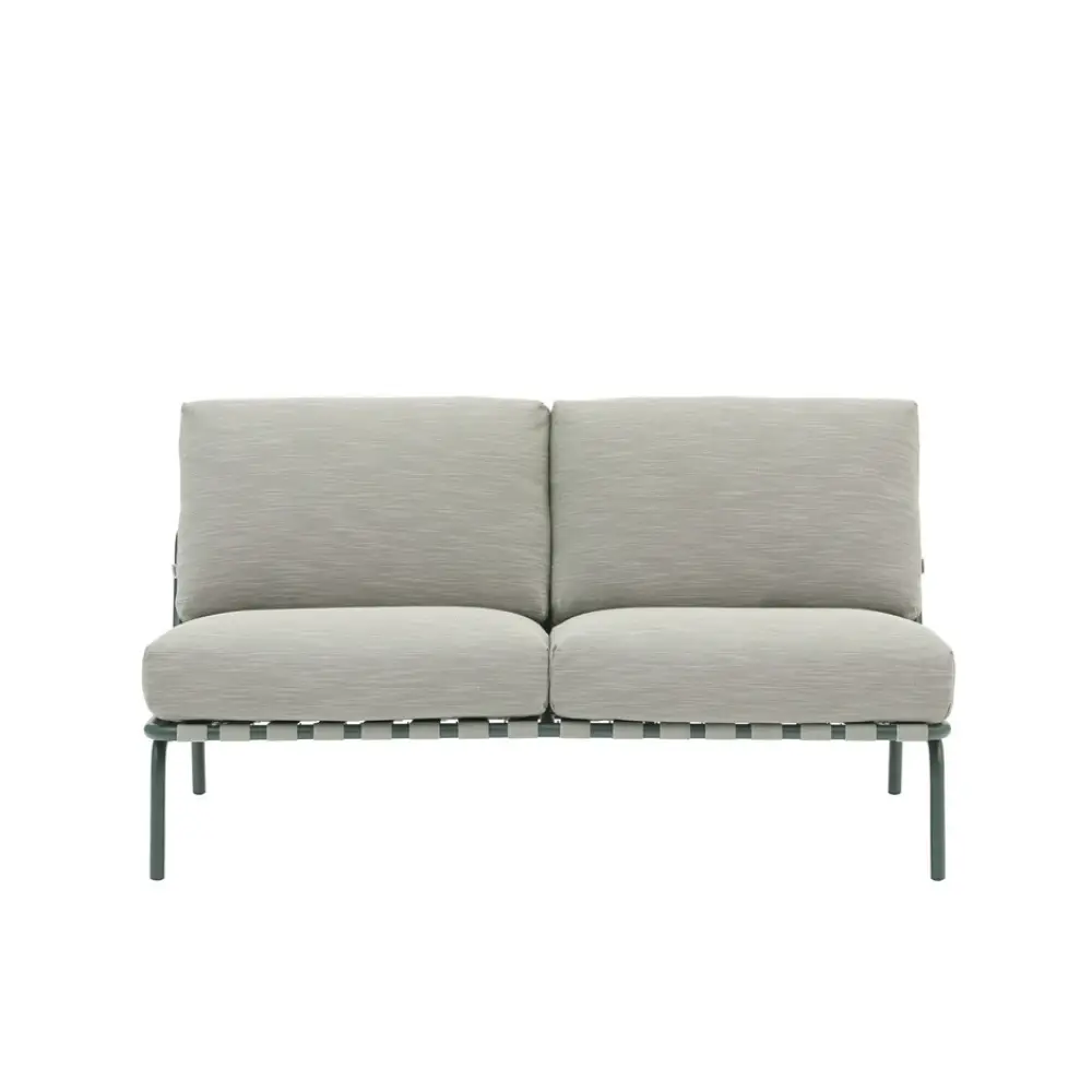 Ramens galvaniserade och pulverlackerade stål motstår rostning långsiktigt. Mjuka dynor i snabbtorkande utomhusmaterial tål regn och säsonger utan att förlora sin charm. En soffa som passar överallt — på egen terrass, på altanen eller helt enkelt som din favoritplats att samlas.