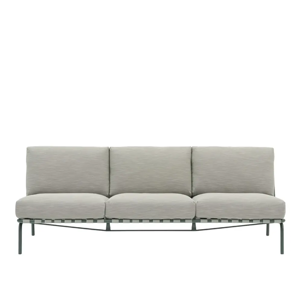 Ramens galvaniserade och pulverlackerade stål motstår rostning långsiktigt. Mjuka dynor i snabbtorkande utomhusmaterial tål regn och säsonger utan att förlora sin charm. En soffa som passar överallt — på egen terrass, på altanen eller helt enkelt som din favoritplats att samlas.