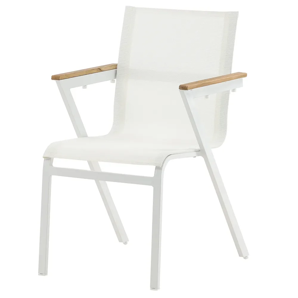 Armstöden i teak ger stolen en elegant touch och tillför en extra dimension till dess utseende. Dess stapelbara design gör den inte bara praktisk utan också enkel att förvara när den inte används, vilket gör den till ett utmärkt val för både trädgården och terrassen.