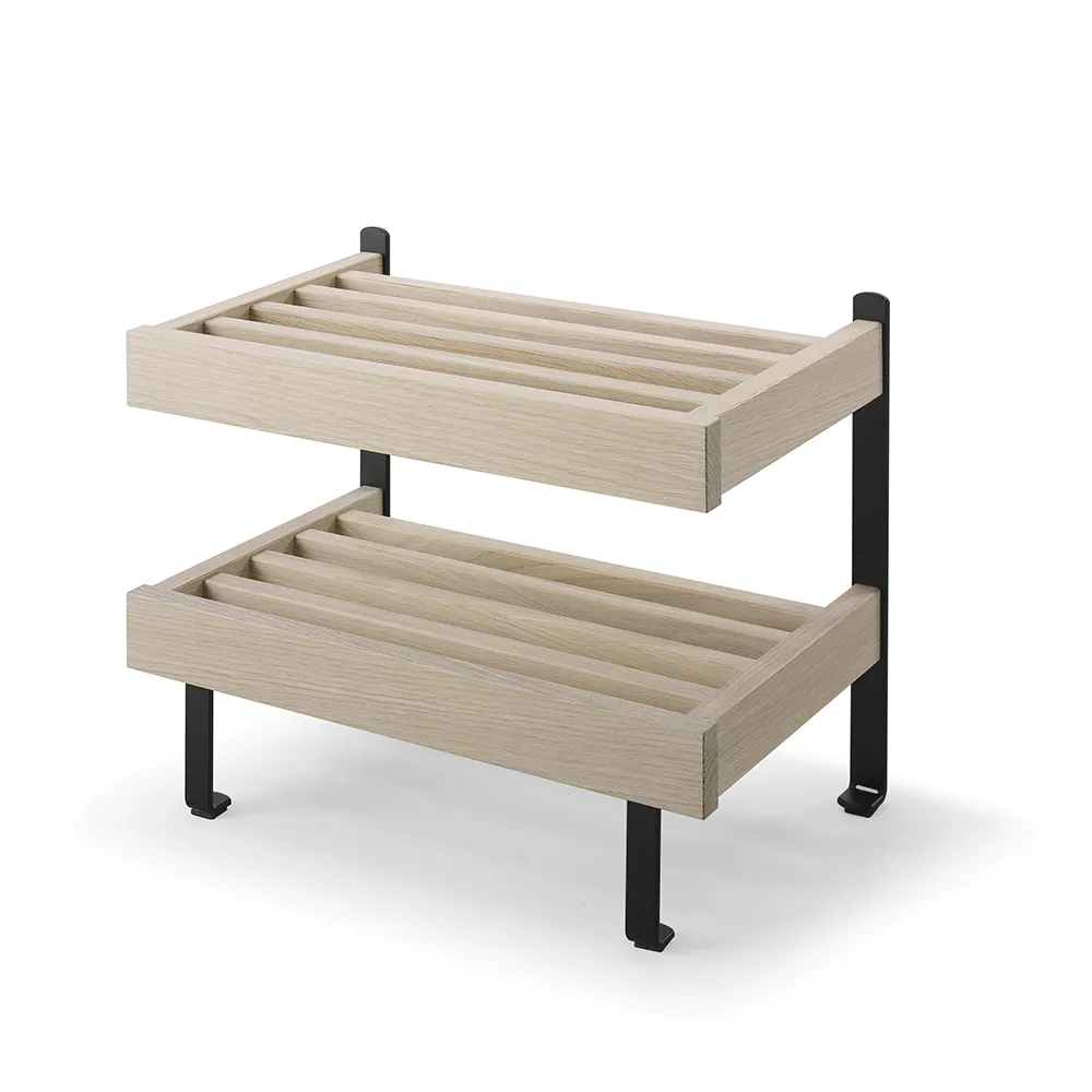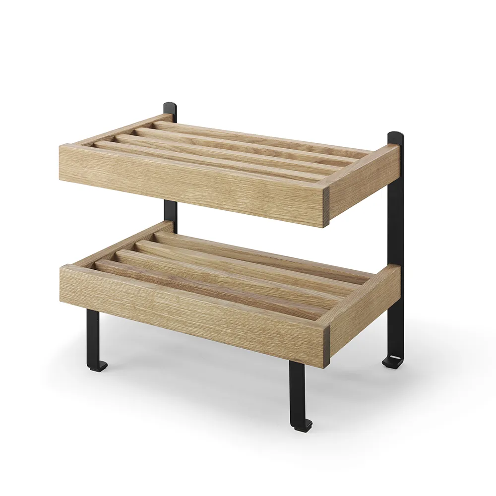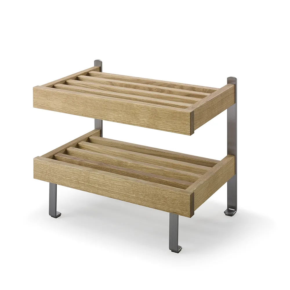 Nadja Skohylla är en elegant golvmodell med två hyllplan och detaljer i slipat stål. Tillverkad i massiv ek eller vitlackad massiv björk, erbjuder denna skohylla både hållbarhet och stil. Nadja Skohylla är en tidlös möbel från Oscarssons Möbel, perfekt för att organisera dina skor på ett snyggt och praktiskt sätt.