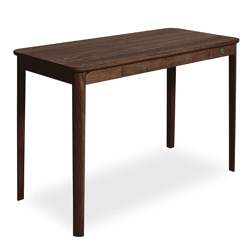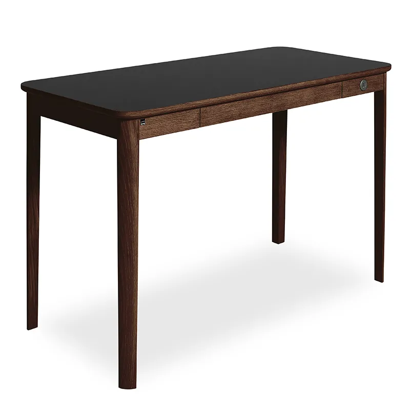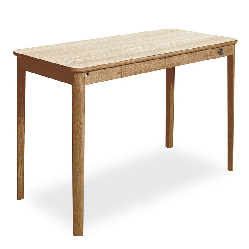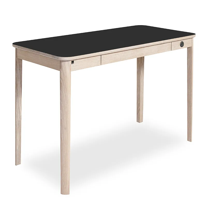 Skrivbordsskivan har rundade hörn och finns i massivt trä samt i laminat. Under skrivbordet finns det förinstallerade USB-uttag och ett rymligt utrymme med kardborrband för att lätt kunna gömma undan sladdar och kablar.
